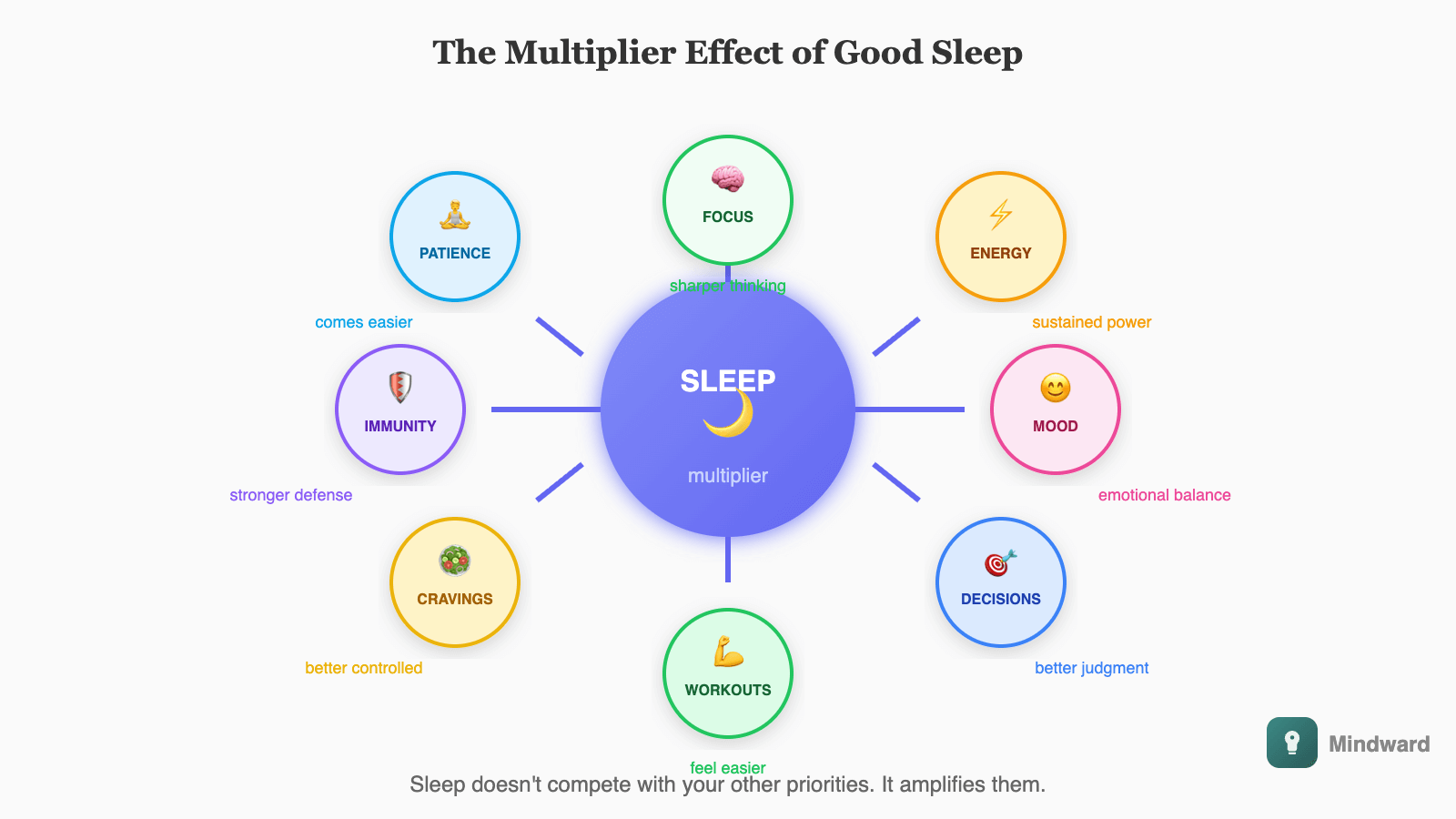 This is the multiplier effect. Every other investment in your health and performance yields higher returns when you're rested. Sleep doesn't compete with your other priorities. It amplifies them.