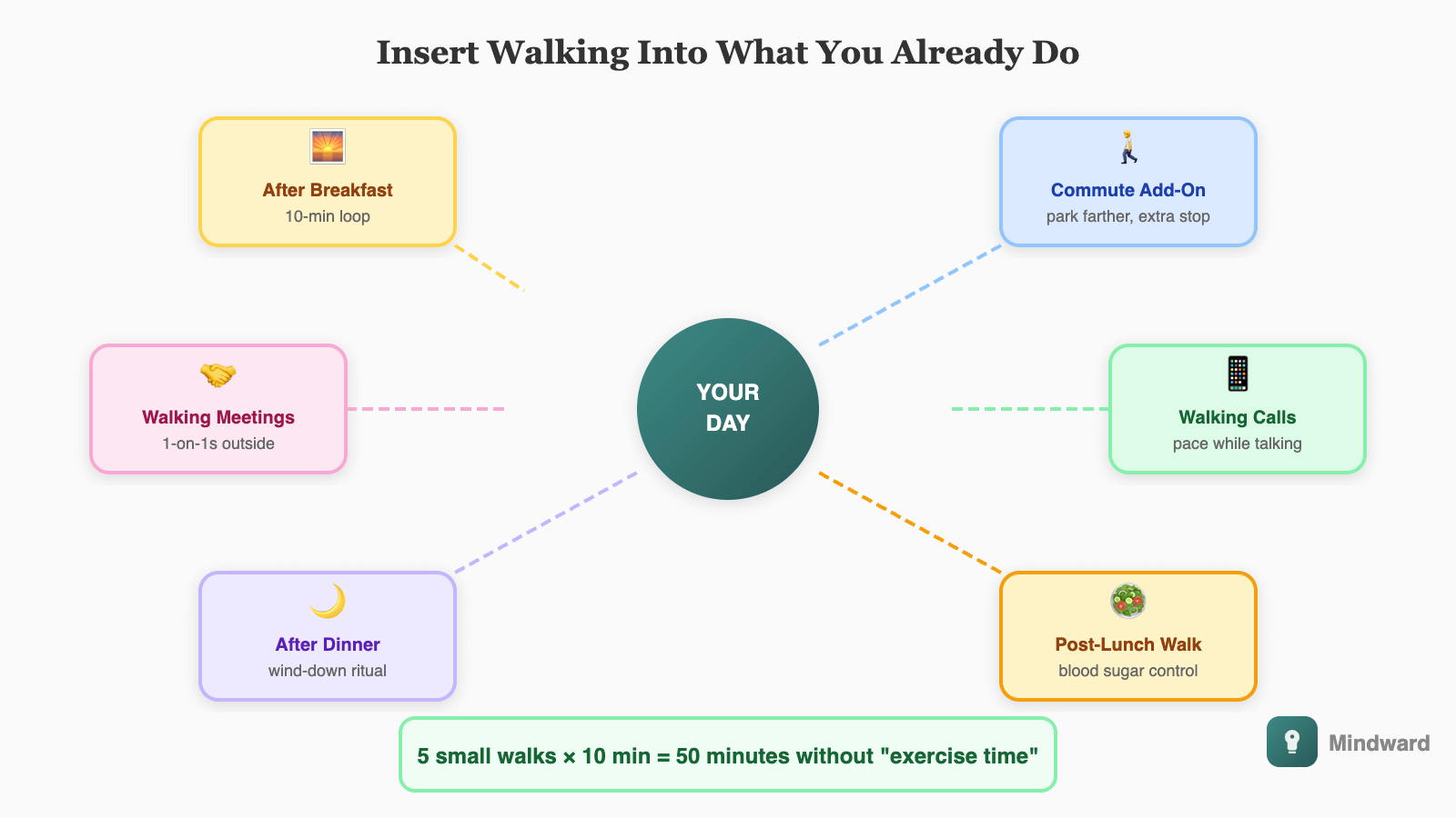 Start with what's easy. A five-minute walk after one meal. A walking meeting instead of a sitting one. Parking farther away. Taking stairs when there are only a few flights. These small insertions accumulate without requiring dedicated workout time.